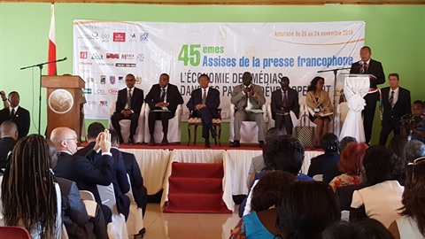 | Les 45es Assises de la presse francophone ont débuté le 21 novembre dans la ville d’Antsirabe, à Madagascar, en présence du président malgache Hery Rajaonarimampianina (3e à gauche). |
