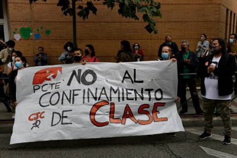 | Dans le quartier de Carabanchel à Madrid, le 20 septembre, lors d'une manifestation contre les nouvelles restrictions anti-coronavirus imposées à seulement certains quartiers de la ville. |