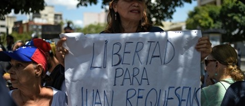 | Des opposants manifestent le 11 août 2018 à Caracas, au Venezuela, pour réclamer la libération du député d'opposition Juan Requesens, arrêté sous l'accusation d'avoir soutenu "l'attentat" contre le président Maduro. |