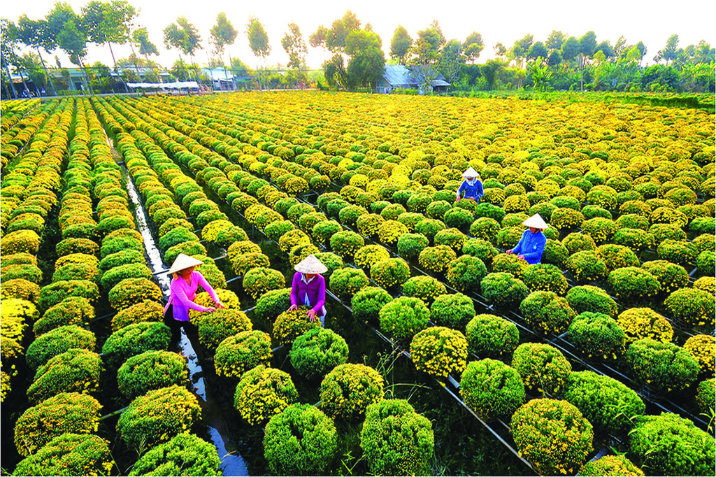 Dans le delta du Mékong, les maisons se parent de chrysan-thèmes dorés, dont les pétales soyeux évoquent la richesse, et de soucis orangés, qui apportent une touche de gaieté et symbolisent la santé et la longévité.