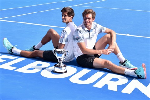 | Pierre-Hugues Herbert (gauche) et Nicolas Mahut, vainqueurs en double messieurs, à Melbourne, le 27 janvier. |