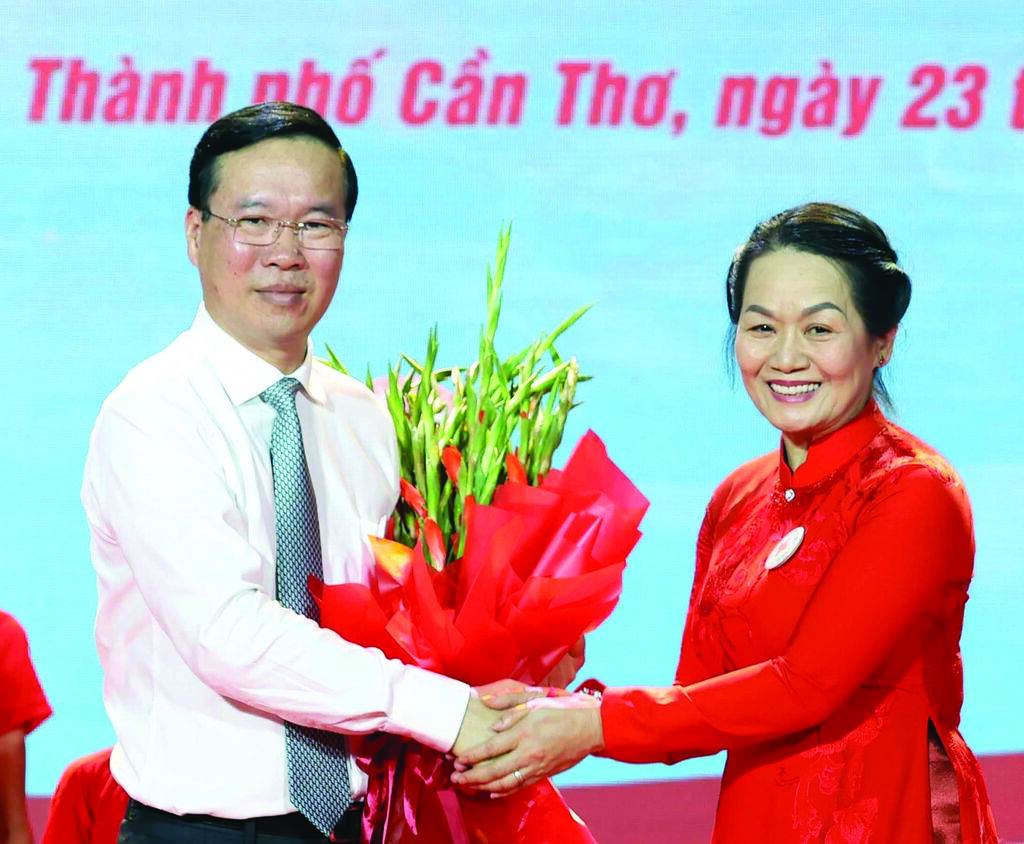 | La présidente de la Croix-Rouge du Vietnam, Bùi Thi Hoà, félicite le chef de l’État, Vo Van Thuong, pour son titre de président honoraire de la Croix-Rouge vietnamienne. |