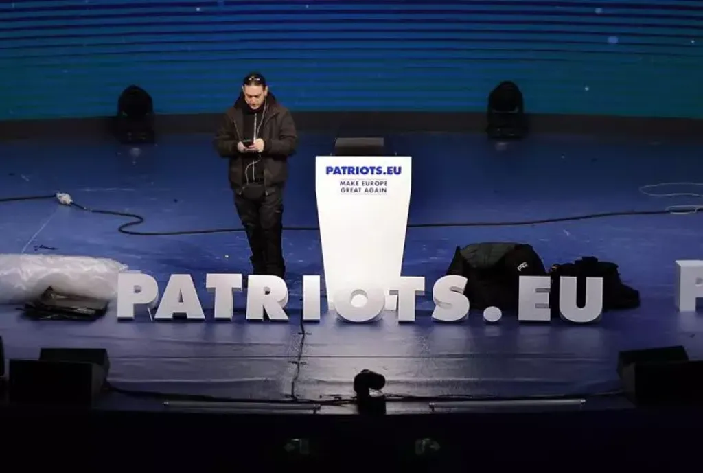 | Un technicien installe la scène du meeting du groupe parlementaire Patriotes pour l'Europe, le 7 février 2025 à Madrid. |
