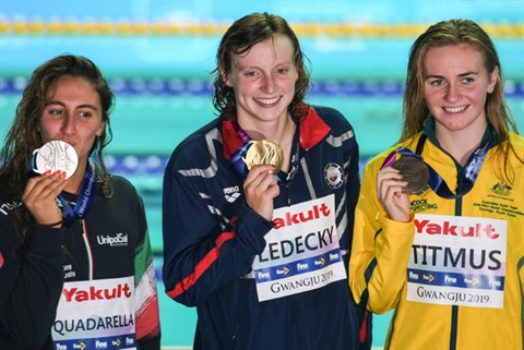 | L'Américaine Katie Ledecky (centre) médaille d'or aux championnats du monde de natation à Gwangju le 27 juillet 2019. |