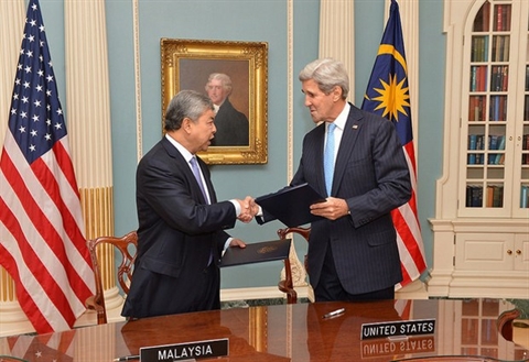 | Le vice-Premier ministre malaisien Ahmad Zahid Hamidi (gauche) et le secrétaire d'État américain John Kerry, lors d'une rencontre tenue le 8 octobre à Washington. |