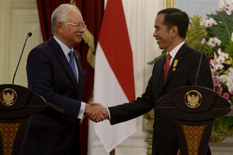 | Le Premier ministre malaisien, Najib Razak (gauche), et le président indonésien, Joko Widodo lors d'une conférence de presse le 1er août à Jakarta. |