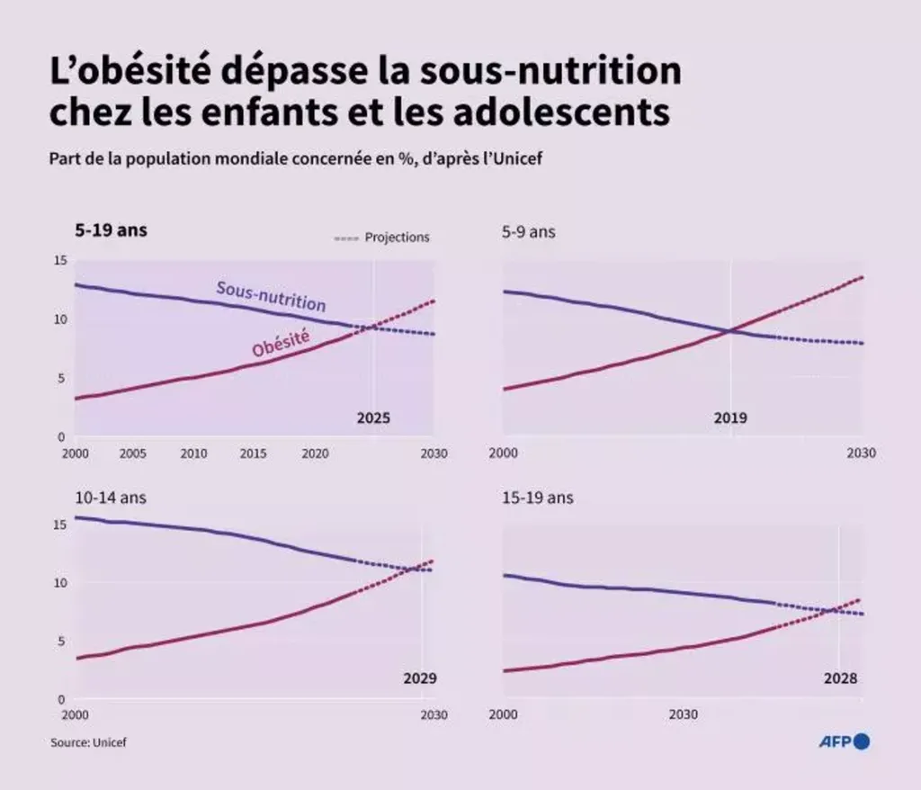 Sur la base des deux tendances inverses, l'UNICEF estime que "2025 marque un tournant historique" : "Pour la première fois, la prévalence mondiale de l'obésité chez les enfants et adolescents en âge scolaire dépasse celle de l'insuffisance pondérale (9,4% contre 9,2%)".