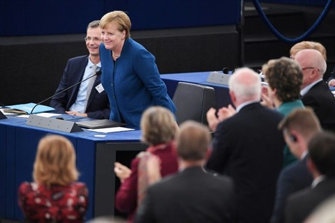 | Angela Merkel devant le parlement européen à Strasbourg, le 13 novembre. |
