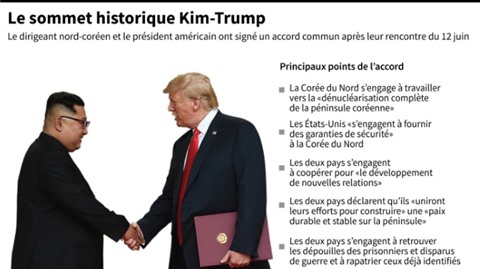 Les principaux points de l'accord commun signé par le dirigeant nord-coréen Kim Jong Un et le président américain Donald Trump. Photo: AFP/VNA/CVN |