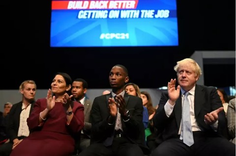 | Boris Johnson (droite) au côté de la ministre de l'Intérieur, Priti Patel, lors de la conférence annuelle des conservateurs à Manchester le 4 octobre. |