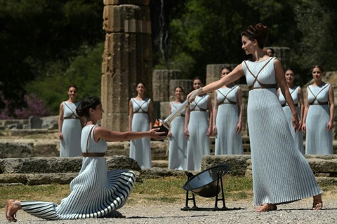 | Cérémonie de l'allumage de la flamme olympique au Temple d'Hera à Olympie, le 21 avril en Grèce. |