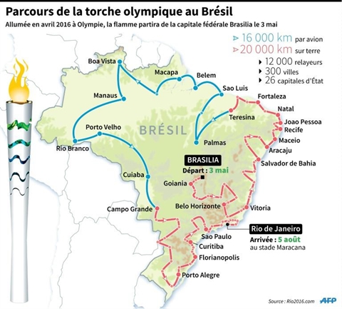 La flamme, allumée par l'actrice grecque Katerina Lehou va entamer un long périple, quelques jours en Grèce puis une traversée de l'Atlantique et un parcours de plusieurs semaines au Brésil, avec 300 villes traversées et 12.000 relayeurs, avant l'arrivée au stade Maracana de Rio pour la cérémonie d'ouverture, le 5 août.