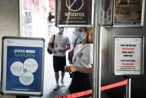 | L'entrée d'un cinéma avec vérification du pass sanitaire et port du masque obligatoire, à Paris le 21 juillet 2021. |