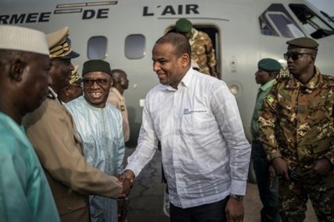| Le Premier ministre malien Boubou Cissé est accueilli par des dignitaires à son arrivée à Sévaré, dans le centre du Mali, le 3 juillet. |