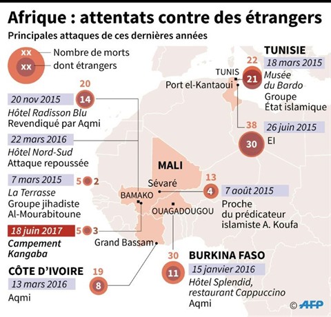 Le type d'objectif rappelle celles visées par les groupes jihadistes du Sahel ces dernières années, notamment la station balnéaire ivoirienne de Grand-Bassam (mars 2016, 19 morts, dont huit étrangers).