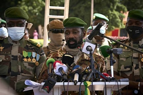 | Le chef de la junte militaire au Mali, Assimi Goïta, devenu vice-président, lors d'une conférence de presse le 22 septembre à Bamako. |