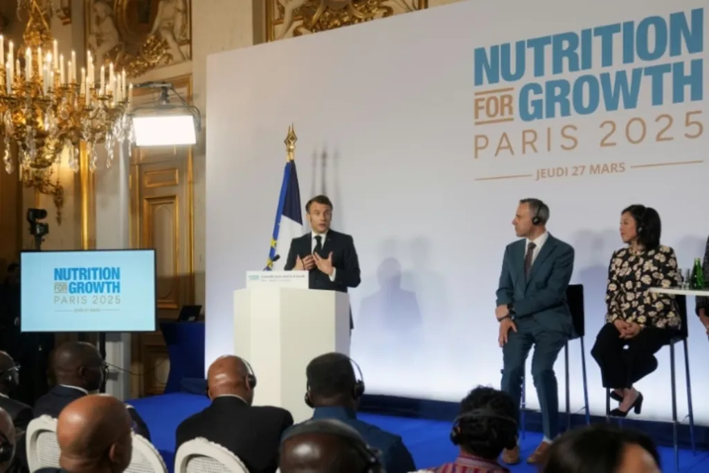 | Le président Emmanuel Macron au sommet "Nutrition for Growth", le 27 mars 2025 à Paris. |