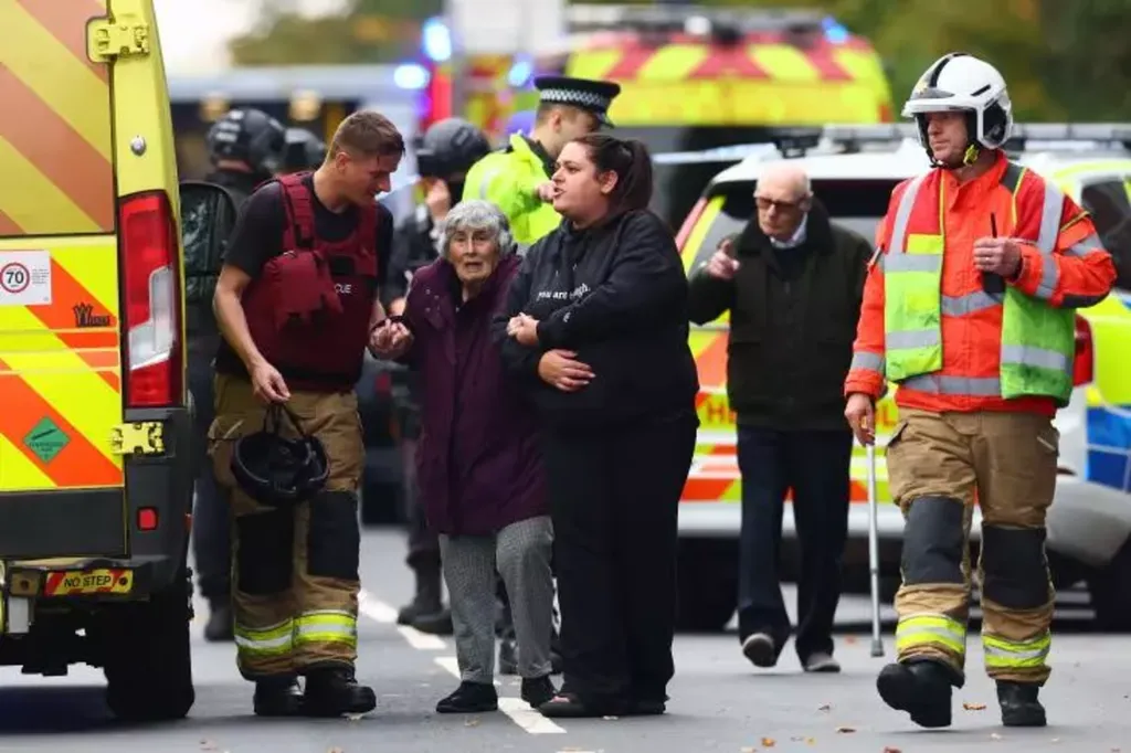 | Les services de secours évacuent des membres de la communauté juive après une attaque meurtrière contre une synagogue, le 2 octobre à Manchester (Royaume-Uni). |
