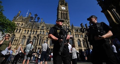 | Des policiers en faction place Albert, le 26 mai à Manchester. |