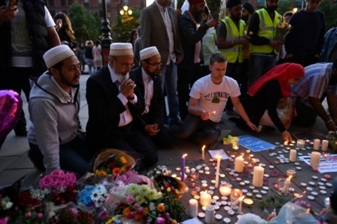 | Des personnes se recueillent et prient en mémoire des victimes de l'attentat de Manchester, le 23 mai à Manchester. |