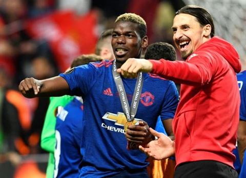 | Paul Pogba et Zlatan Ibrahimovic, le 24 mai 2017 après la victoire finale en Europa League face à l'Ajax à Solna (près de Stockholm). |