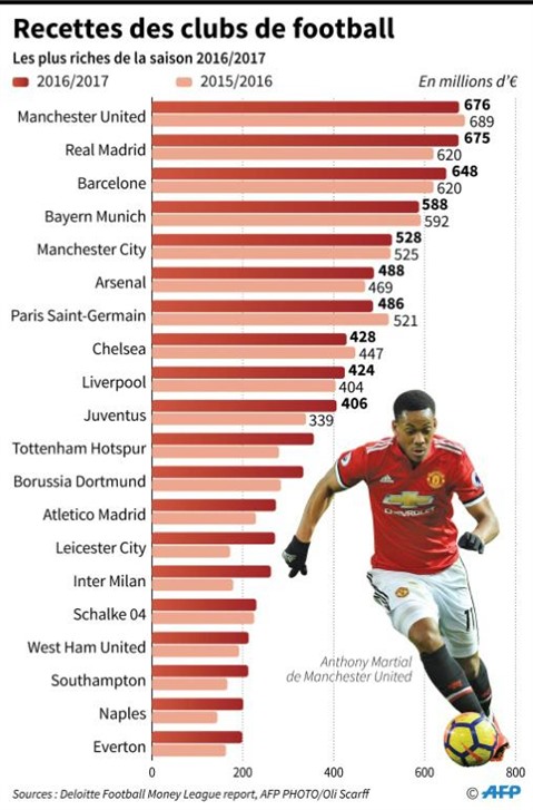 Au total, les vingt clubs les plus riches du monde ont vu lors de la saison 2016/2017 leurs revenus croitre de 6%, atteignant les 7,9 milliards d'euros.