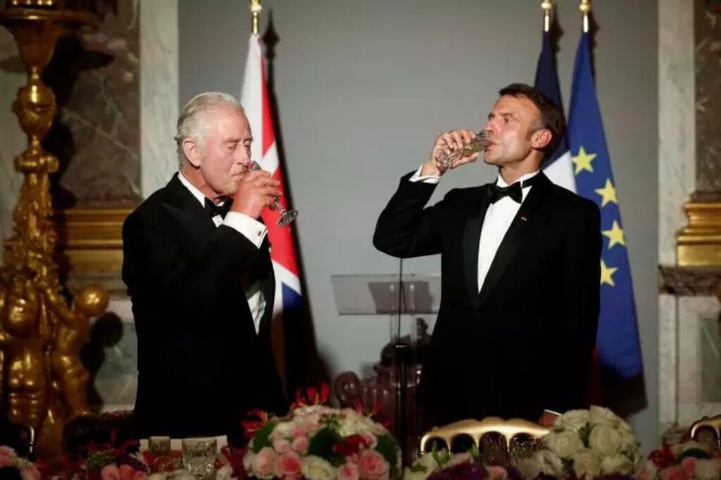 | Le roi Charles III (gauche) et le président français Emmanuel Macron portent un toast lors d'un banquet d'État au Château de Versailles, le 20 septembre à l'ouest de Paris. |