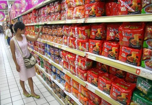 | Une femme achète des nouilles instantanées dans un supermarché chinois. |