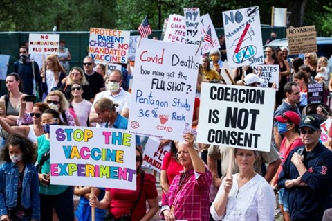 | Des centaines de personnes ont dénoncé l'obligation de vaccin grippal devant le siège du gouverneur du Massachusetts à Boston, le 30 août. |