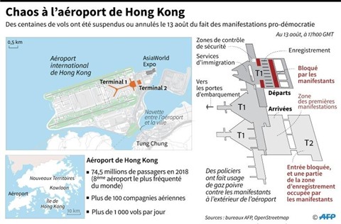 L'ex-colonie britannique traverse sa plus grave crise depuis sa rétrocession à Pékin en 1997. Parti début juin du rejet d'un projet de loi hongkongais qui entendait autoriser les extraditions vers la Chine, le mouvement a considérablement élargi ses revendications pour dénoncer le recul des libertés et les ingérences de Pékin. Au cinquième jour d'une mobilisation sans précédent à l'aéroport, les contestataires ont obstrué les allées et les passages conduisant aux zones d'embarquement. En réaction, les autorités aéroportuaires ont pris la décision d'annuler les procédures d'enregistrement pour tous les vols prévus à partir du milieu de l'après-midi.