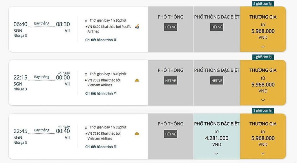 La ligne Hô Chi Minh-Ville (SGN) - Hanoï (HAN), considérée comme la plus dynamique du réseau intérieur vietnamien, connaît une progression quotidienne des tarifs. Pour de nombreux créneaux prisés, les sièges sont déjà complets et la classe économique n’est plus disponible, notamment durant la période du Têt 2025, du 2 février au 3 mars 2026. À cette date, Vietnam Airlines affiche des prix allant de 5,4 à 9,9 millions de dôngs pour un départ le 12 février, les billets les plus abordables étant déjà épuisés. Vietjet enregistre la même tendance, avec des tarifs atteignant 6,4 millions de dôngs et une réduction notable de l’offre en classe premium.