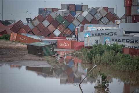 | Des conteneurs sont emportés par les eaux de crue dans la province du KwaZulu-Natal, en Afrique du Sud, le 13 avril. |