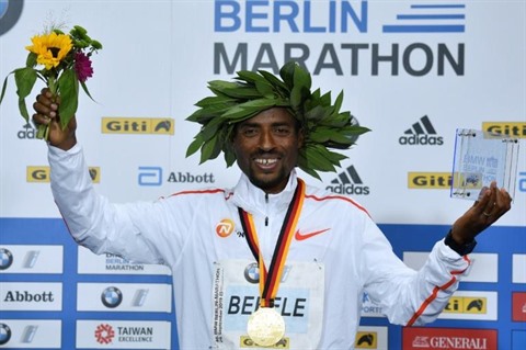 | L'Éthiopien Kenenisa Bekele, vainqueur du marathon de Berlin, le 29 septembre 2019. |