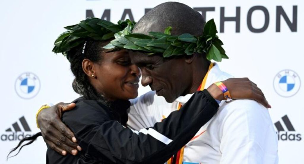 | Le Kényan Eliud Kipchoge (droite) et l'Éthiopienne Tigist Assefa après leurs victoires lors du marathon de Berlin, le 25 septembre. |