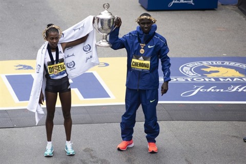 | L'Éthiopienne Worknesh Degeva (gauche) et le Kenyan Lawrence Cherono remportent le marathon de Boston le 14 avril. |