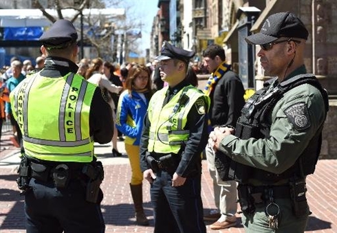 | Des policiers déployés à la veille du marathon de Boston endeuillé en 2013 par un double attentat, le 20 avril |