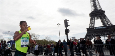 | L'Éthiopien Kenenisa Bekele passe devant la Tour Eiffel, dimanche 6 avril, lors du marathon de Paris |