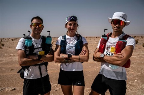 | Dorian Louvet, Alix Noblat et Mathieu Blanchard, anciens participants de Koh-Lanta, posent le 2 octobre à Borj Irdi, dans le désert marocain, à la veille du départ du Marathon des Sables. |