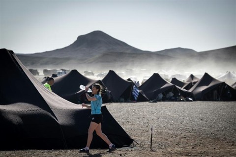 | Une concurrente passe devant le bivouac dressé pour le Marathon des Sables, le 26 mars 2022 à Timgaline (Maroc), à la veille du départ dans la province d'Errachidia, pour une semaine de traversée du désert du Sahara. |