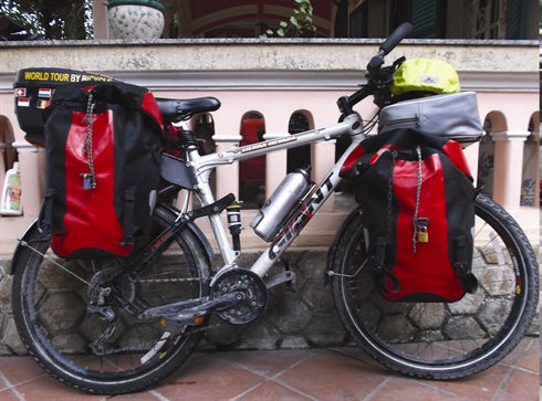 Marc Delval part avec un vélo quasi-neuf, identique à son ancienne monture, avec un cadre robuste équipé de freins à disque, de suspensions et de nombreux cadres de renforts pour ses sacoches. Nu, l’engin pèse plus de 23 kilos et atteint allègrement les 60 kg une fois les bagages en place : «J’ai beaucoup de bagages : des vêtements chauds, d’été, des chaussures, ma tente, des produits de pharmacie, des outils de premiers secours, du matériel de dépannage, des appareils photo, un cahier, un ordinateur portable, etc.». Il considère son vélo comme sa maison, sa voiture, mais aussi son amour !