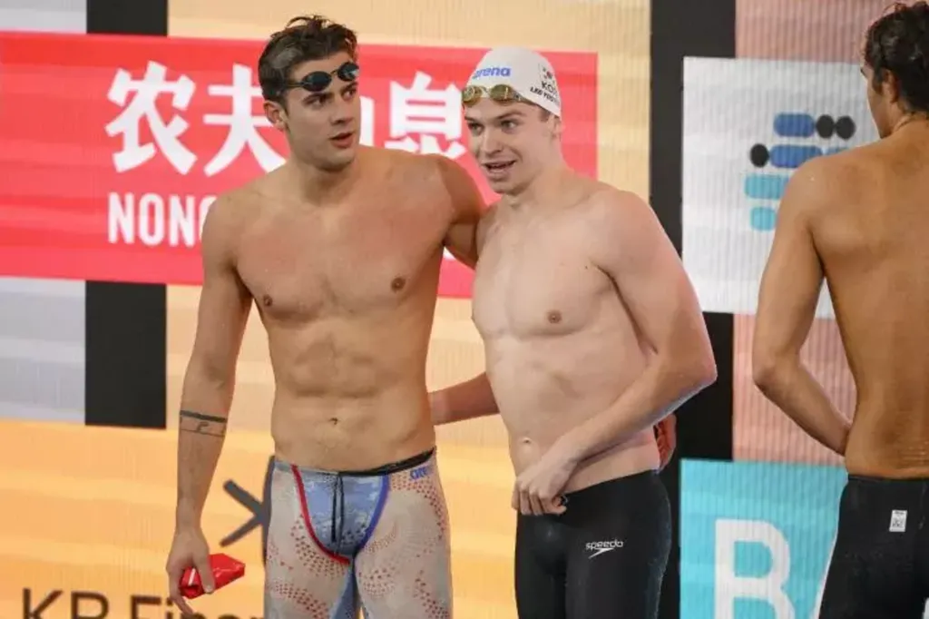 | Le Suisse Noè Ponti et le Français Léon Marchand vainqueur ex-aequo 100 m 4 nages de la Coupe du monde en petit bassin de 25 m à Incheon, le 24 octobre. |