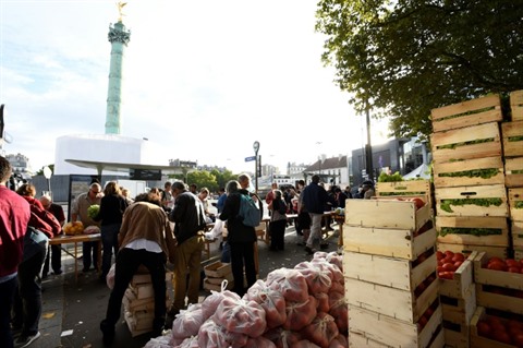 | Marché éphémère organisé par le syndicat agricole Modef, place de la Bastille à Paris, le 17 août. |