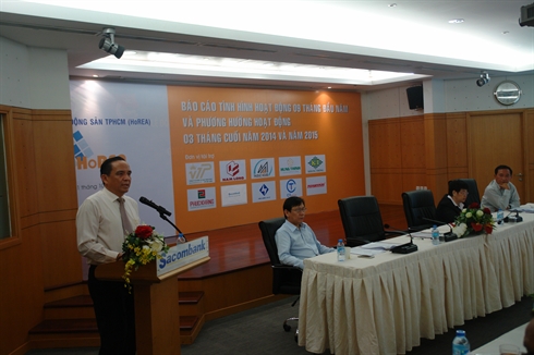 | Le président de l’HoREA, Lê Hoàng Châu (debout), à la conférence «Résultats des affaires commerciales des neuf premiers mois de 2014, plan pour fin 2014 et l’année 2015 de l’HoREA». |