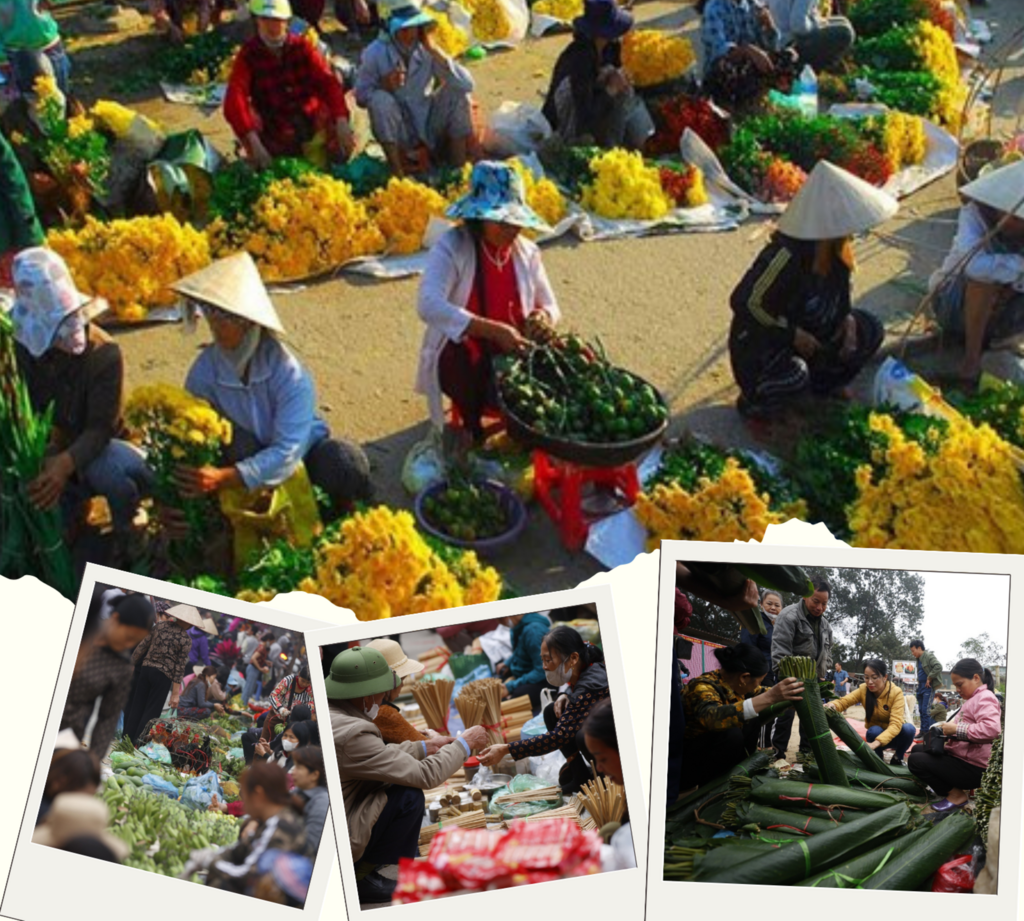 Les marchés du Têt à la campagne sont de vastes espaces remplis d’une large gamme de produits. Des produits agricoles cultivés par les locaux ou provenant d'autres endroits y sont apportés, notamment du riz gluant et des feuilles de dong (Phrynium placentarium) pour faire des banh chung (gâteau de riz gluant farci de viande de porc poivrée et d’haricots mungo de forme carrée) - un plat emblématique du Têt, des échalotes marinées aux bananes et aux noix d'arec. Ceux-ci sont à la fois frais et beaucoup moins chers que dans les zones urbaines, ajoutant ainsi à la diversité des produits à vendre.