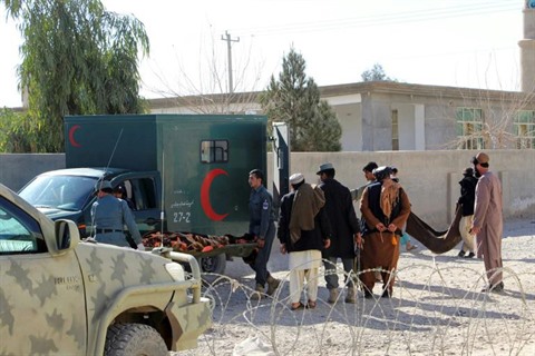 | Des forces de sécurité afghanes et des volontaires retirent les corps du site où a eu lieu un attentat suicide, le 10 janvier à Lashkar Gah. |