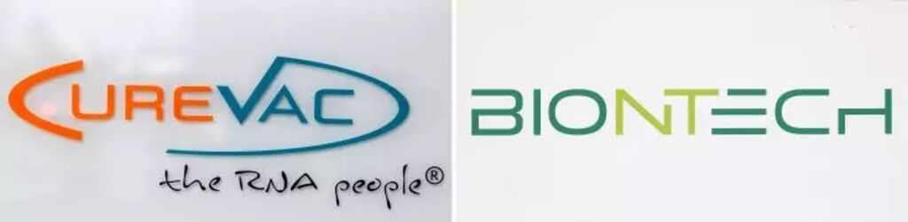 | Logos des deux laboratoires allemands CureVac et BioNTech. |