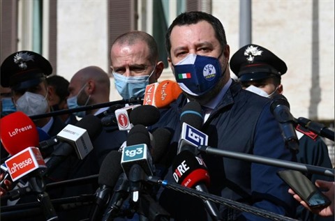 | Le leader de Ligue Matteo Salvini, devant le Parlement italien, après avoir rencontré Mario Draghi le 6 février 2021. |