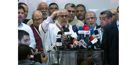 | Le Premier ministre marocain, et secrétaire général du Parti islamiste PJD, Abdelilah Benkirane (centre), parle lors d'une conférence de presse après l'annonce des premiers résultats. |
