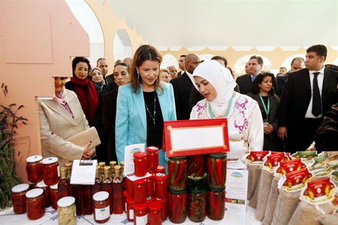 | La Princesse Lalla Meryem (1re à gauche, 1er plan) visite un stand d'exposition des produits fabriqués par les femmes. |