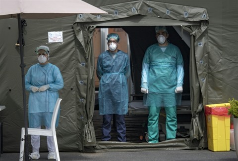 | Des membres de l'équipe médicale de l'hôpital militaire de la capitale Rabat, au Maroc, le 15 avril. |